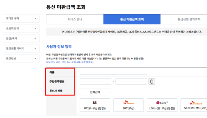 - '통신 미환급금 조회' 메뉴 클릭
